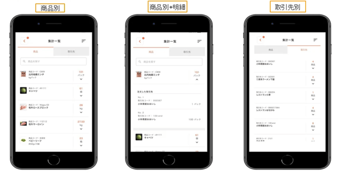 - 発注側(仕入れ仲卸)は、スマートフォンからLINE感覚で簡単に発注を完了できます。これにより、伝票の授受といったアナログなやり取りが一切不要となり、商品の受け取りだけで取引が完了します。(発注側ユーザーJ社様 実績コメント)
