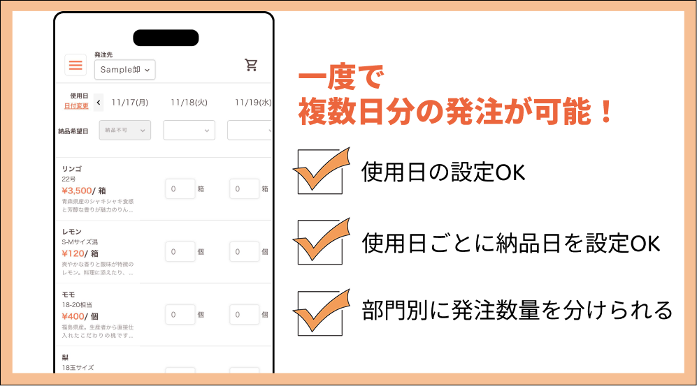- 発注側は、1週間分以上の注文を画面操作でまとめて発注可能です。